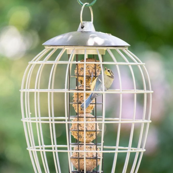 Hang this beautiful feeder on a tree or feeding pole system and enjoy all the small birds which come and investigate! If you’d also like to feed larger birds, then create a feeding area without protective cages on the other side of your garden, this ensures the smaller birds have a safe and accessible feeding area and are not at risk of being scared away.