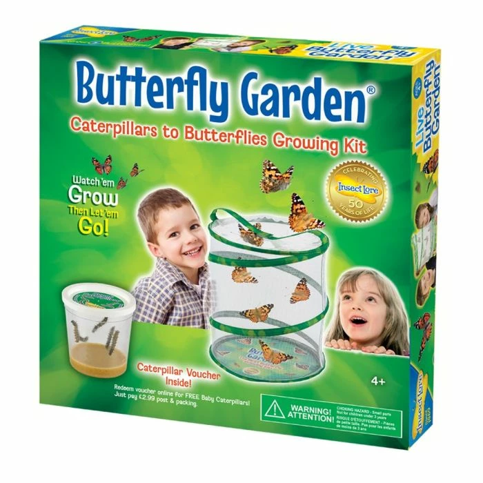 This kit is not supplied with live caterpillars. You will receive a uniquely coded voucher in your kit which you need to redeem online after you’ve received your kit (along with an additional shipping & handling fee of £3.99 – payable to Insect Lore) when you are ready to receive your caterpillars. You will then receive a delivery of 3-5 baby caterpillars with food.